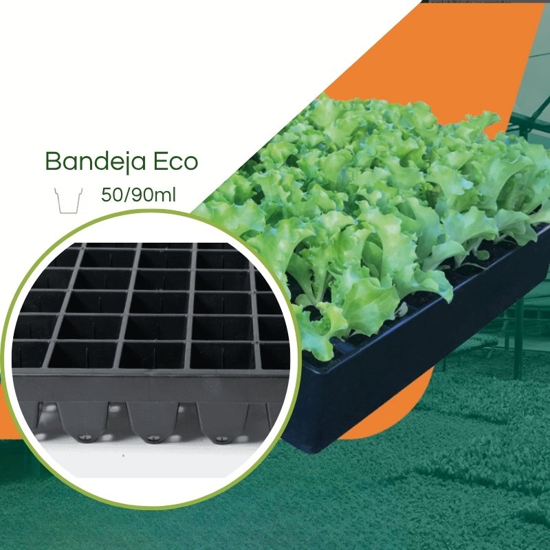 Bandeja em estrutura monobloco e rígida, ideal para transplantio mecanizado; reduz a mão de obra no campo;