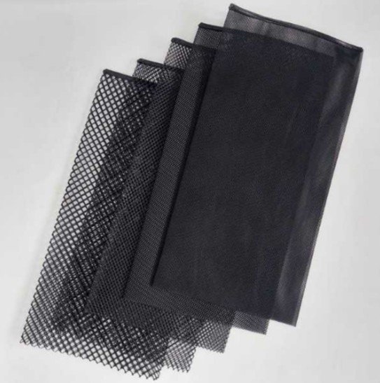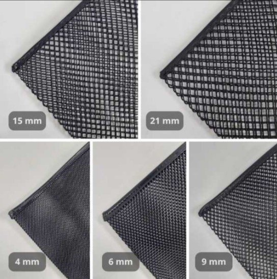 Os travesseiros de ostra com diferentes aberturas de malha (4 mm, 6 mm, 9 mm, 15 mm e 21 mm), para as diversas fases do cultivo de ostra, desde o estágio juvenil até o acabamento final da concha.