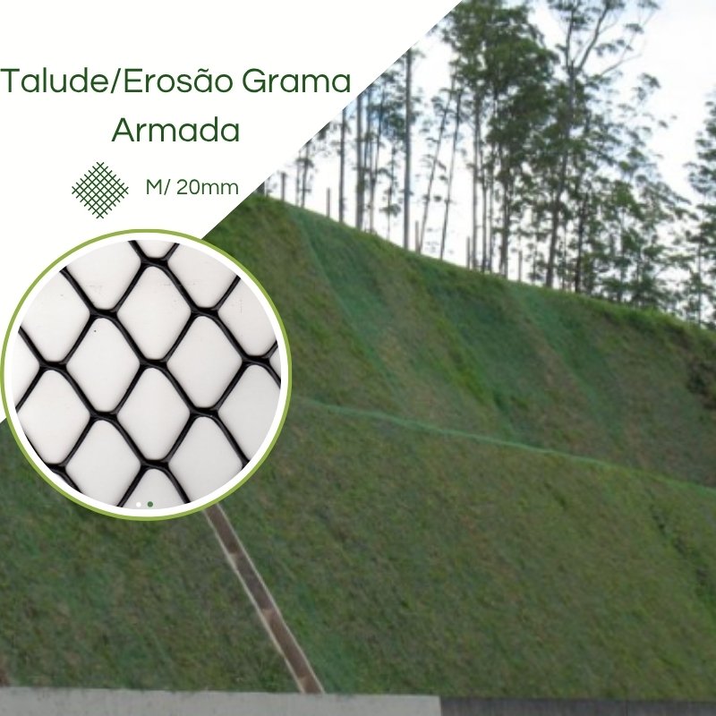 A tela grma armada é uma tela plástica extrusada de alta densidade (PEAD), muito utilizada no controle da erosão superficial.